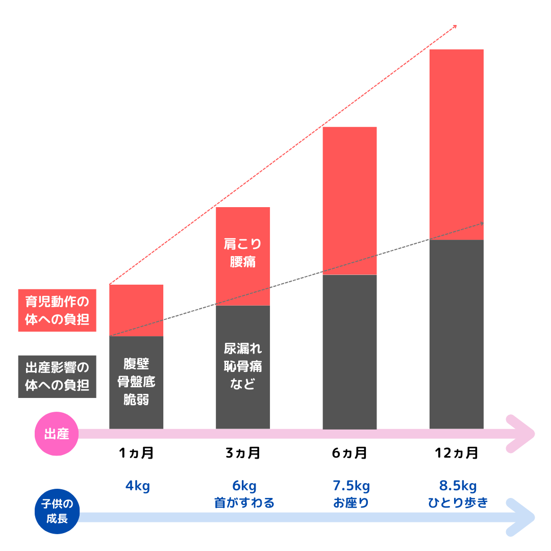 妊娠出産は、筋や靭帯が引き伸ばされたり、アライメントといって骨格や姿勢が大きく変わります。産後は、単純に体重をもどすダイエットでは、これらの変化は回復しません。また、出産時に受けた身体のダメージは時間の経過とともに回復しても、お子さんは成長とともに体重が増えることで、抱っこや育児動作によるママの負担は産後1年経過しても継続し、体力的な不安を訴える方も多くいます。産後はダイエットだけで筋力が落ちてしまうと、さらに体力的な負担が大きくなります。