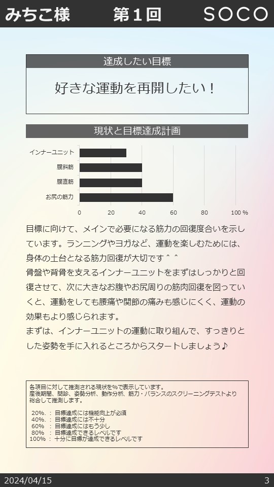そしてその分析とみなさんの目標に基づいて、運動計画を設計します。分析と計画を定期的に繰り返し実施。身体だけでなく、生活行動、お子さんの成長に伴う身体への負担の変化など、未来予測とともに、細やかにアップデートされ、目標への道のりがより精緻になります。