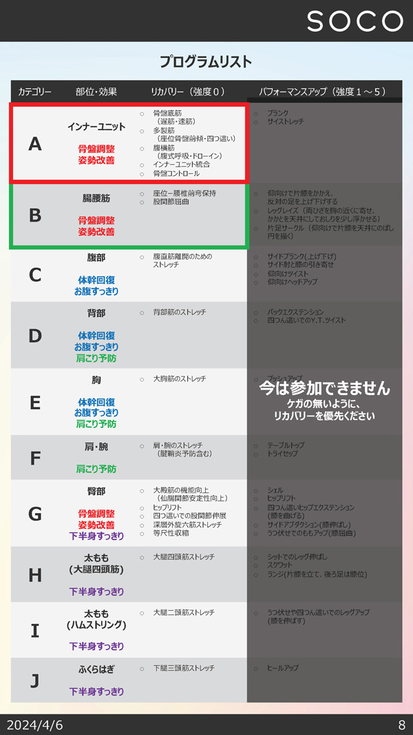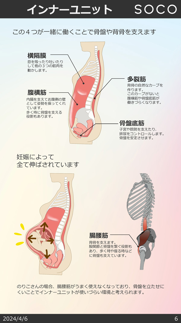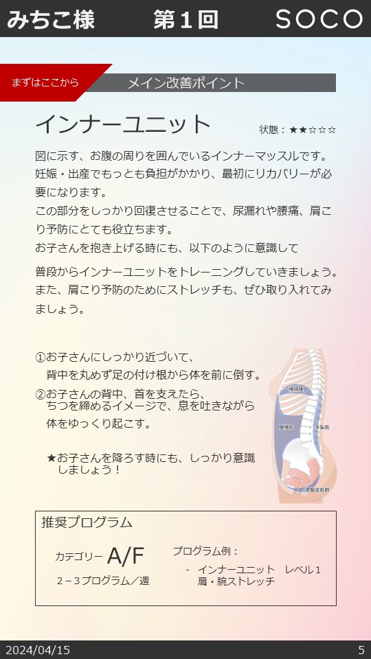 SOCOの運動は、妊娠出産での変化を徹底的に考えた運動療法で、特にインナーユニットの回復を大切にしています。女性の身体専門家が監修し指導。妊娠出産はもちろん、その後の女性ならではの悩みにお応えしています。身体だけでなく、ライフステージの変化、生活上の障害、女性に起こりがちなトラブルに寄り添っています。