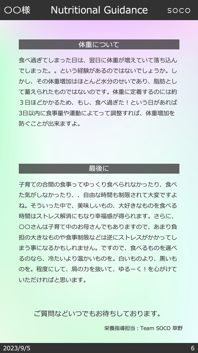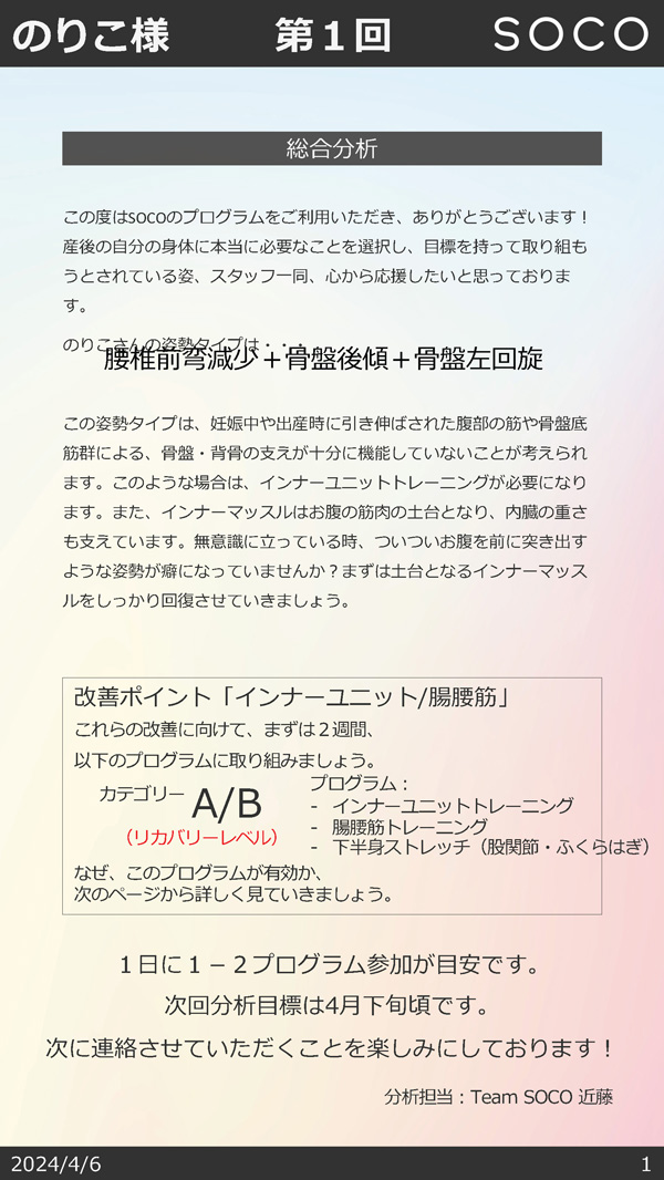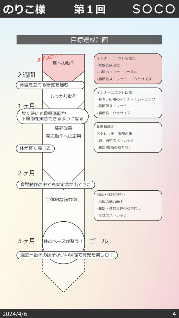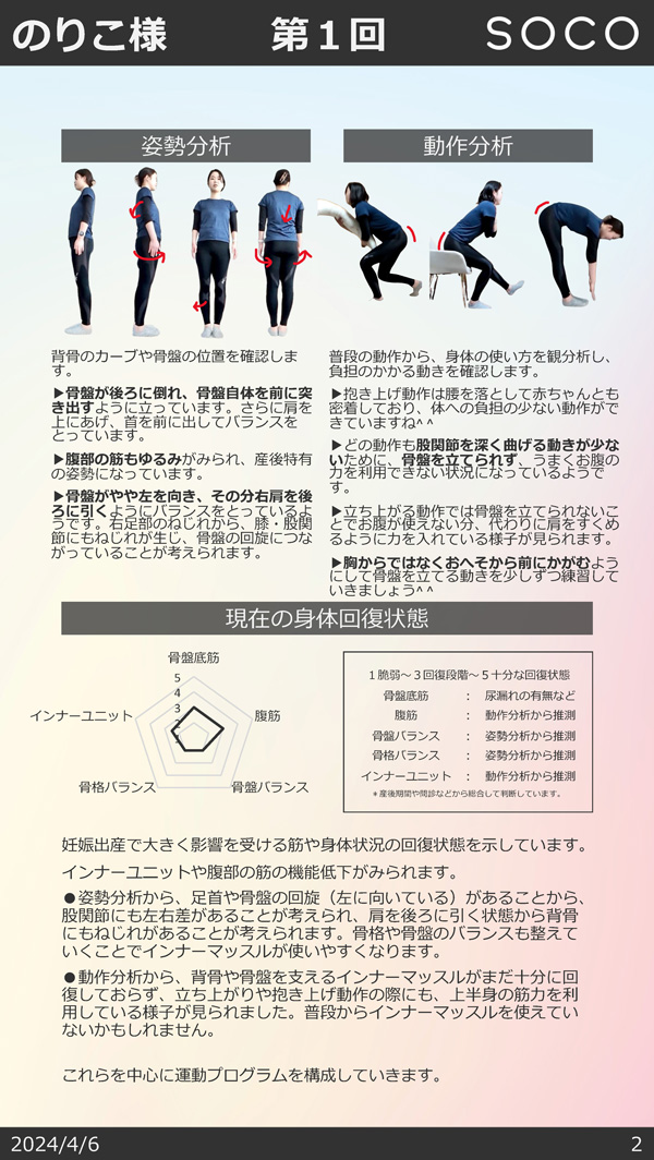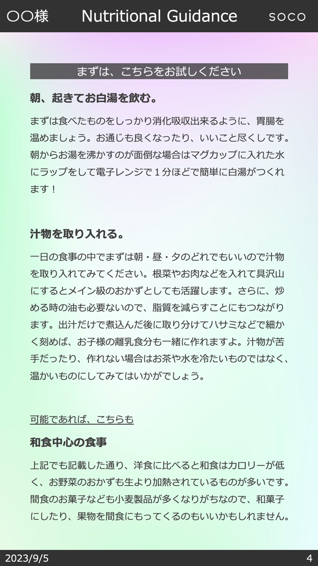 - 個別プラン:分娩様式や身体の状態に合わせたリカバリープランを提案。